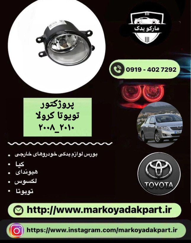 پروژکتور تویوتا کرولا Toyota Corolla از اجزای سیستم روشنایی این خودرو و برای افزایش ایمنی خودرو طراحی شده اند. آن ها به گونه ای طراحی شده اند که روشنایی مستقیم به سطح و لبه های جاده اضافه کنند.